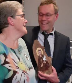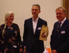 Lene Juul Pedersen og Peter Mollerup. Lene med den fornemme pris: En ikon med den hellige Frans af Assisis.