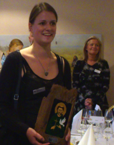 Prisen er en ikon med dyrenes skytshelgen, Den Hellige Frans af Assisi udført af kunstneren Birgitte Hansen, som ses bagest i billedet.