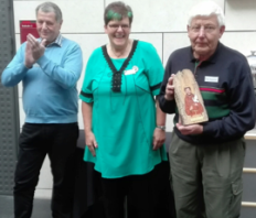 Til højre en stolt Erik Rasmussen med ikonet. I Midten ses formanden Karin Sørensen flankeret af Mogens Wilbert fra bestyrelsen.